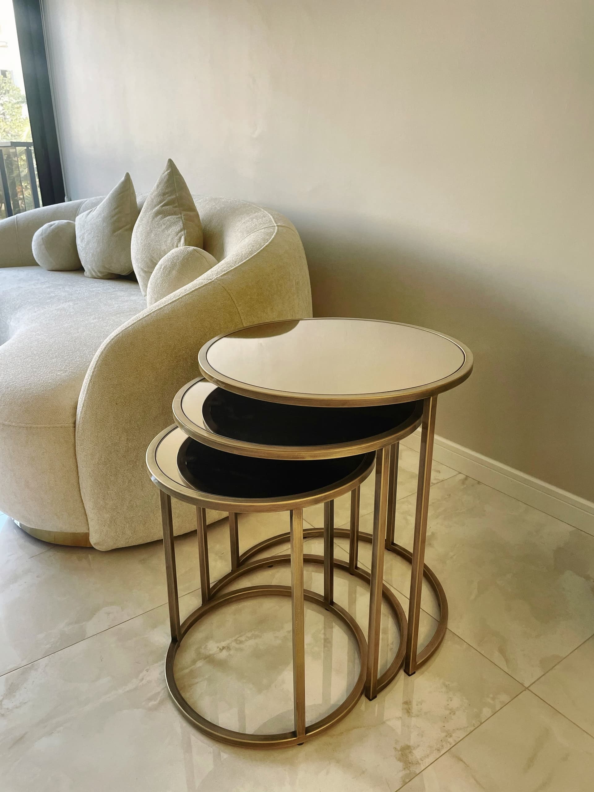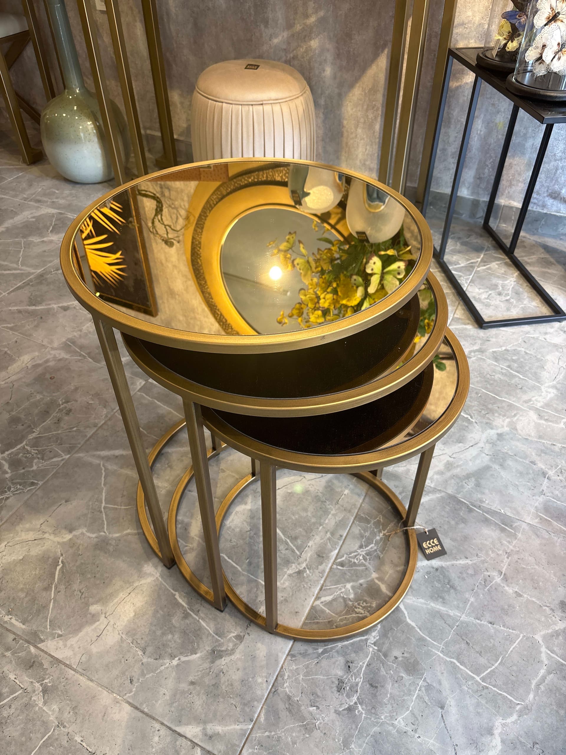 Eskitme altın rengi, bronz ayna zeminli servis sehpa takımı. Adet ve ölçülerde değişiklikler yapabilirsiniz. Üretim ve tasarım bize aittir. Modelde standart ölçülerde, takımın en büyük parçası 50 cm çapında 58 cm yüksekliğinde