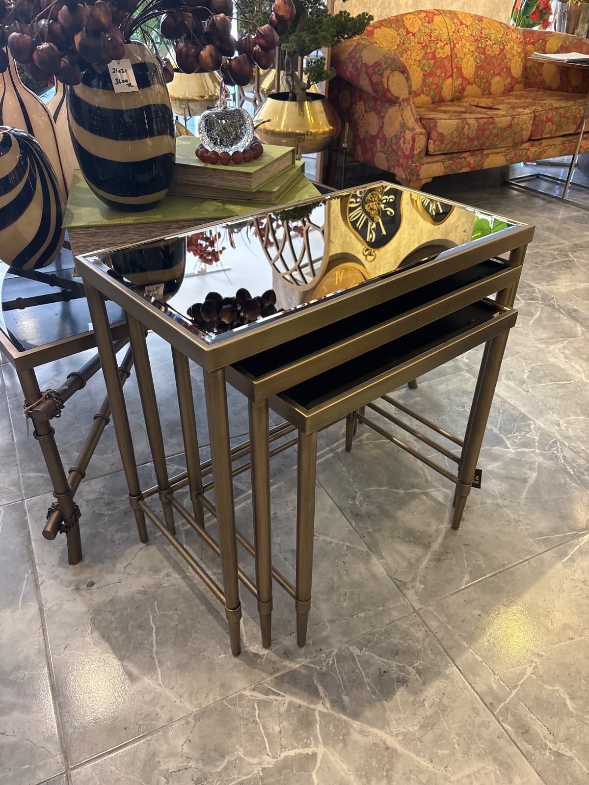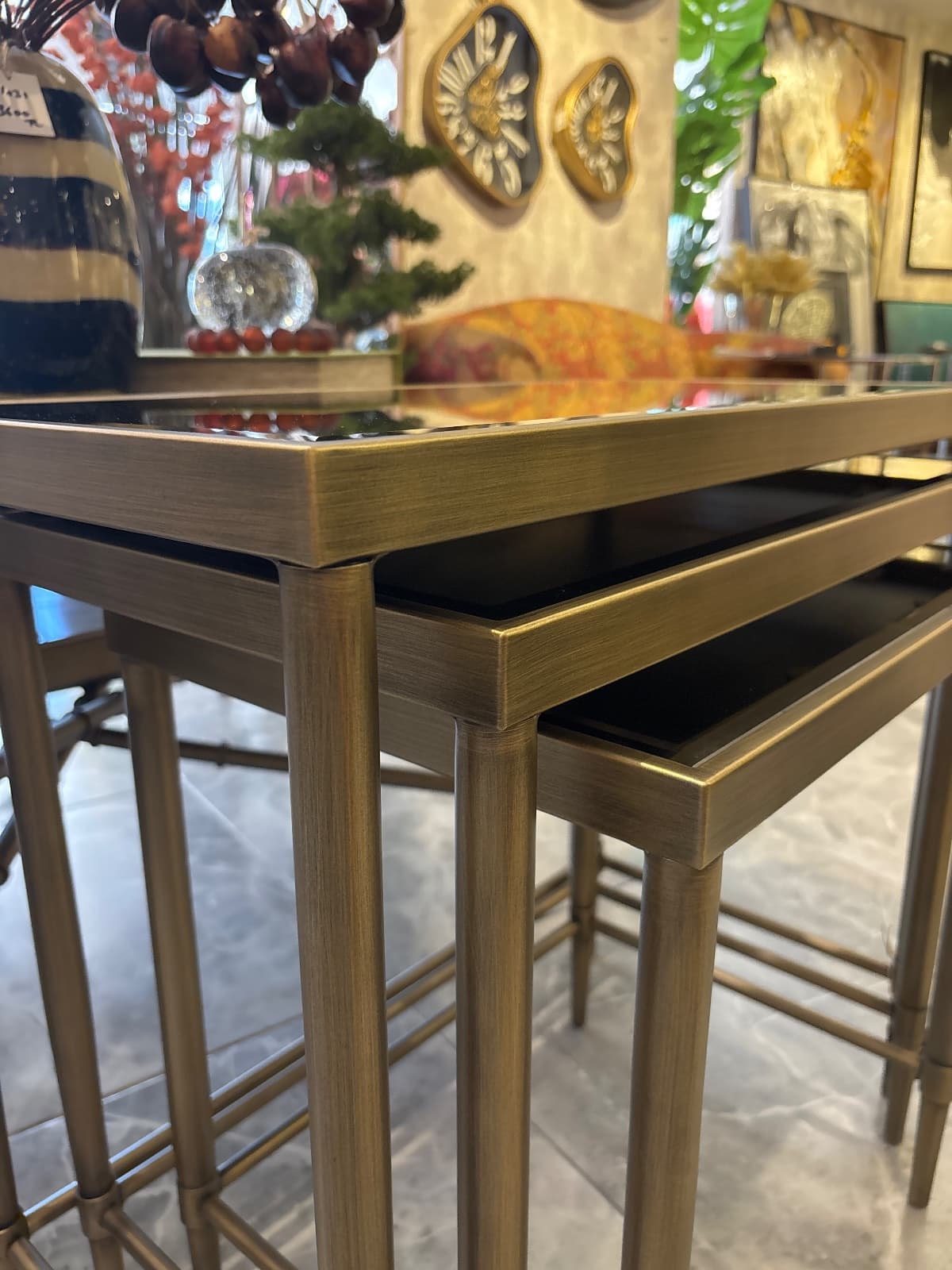 En büyük boyu 65 × 35 cm ölçülerde 60 cm yüksekliğinde. Eskitme altın rengi, bronz ayna yüzeyli üçlü zigon sehpa takımı. Üretim ve tasarım bize aittir. Özel ölçüler için bize WhatsApp üzerinden ulaşabilirsiniz