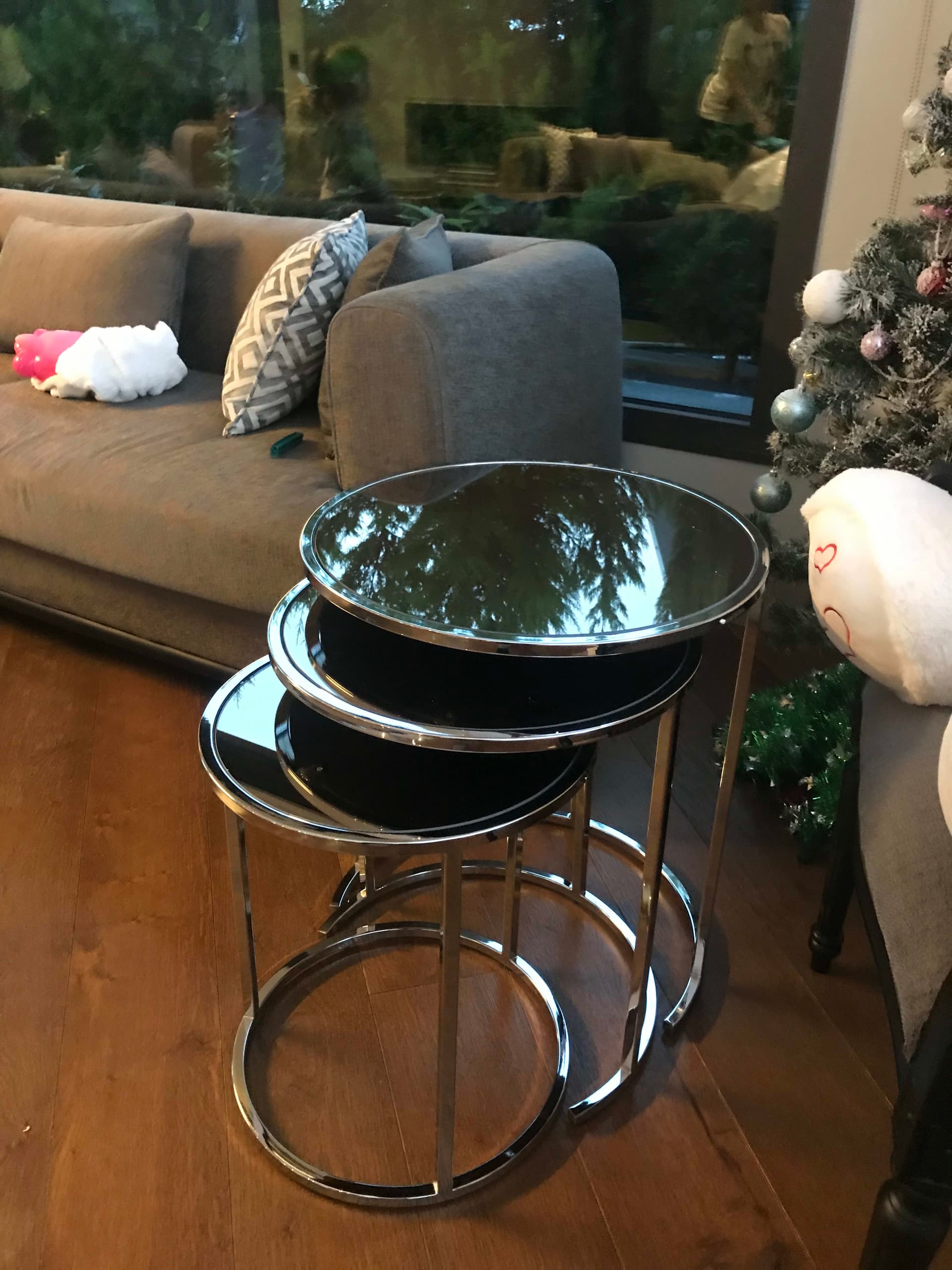 Krom rengi, bronz ayna zeminli servis sehpa takımı. Adet ve ölçülerde değişiklikler yapabilirsiniz. Üretim ve tasarım bize aittir. Modelde standart ölçülerde, takımın en büyük parçası 50 cm çapında 58 cm yüksekliğinde